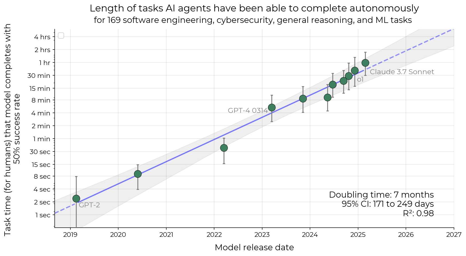 We could gradually lose our ability to compete with AI and effectively become irrelevant. This connects directly to what the METR study shows us - as AI systems become capable of handling longer and more complex tasks, they’re moving into territory that was previously the exclusive domain of human professionals. It will be hard to justify spending twice as much for human work that’s only half as good.